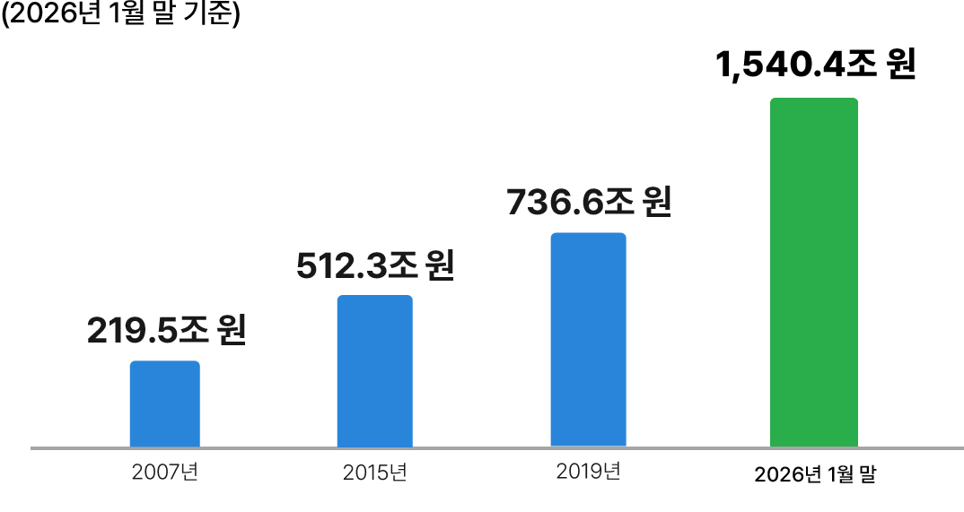 기금 적립금 현황: 2007년 219.5조원, 2015년 512.3조원, 2019년 736.6조원, 2025년 2월 1227.5조원