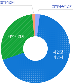 사업장 67.51%, 지역가입자 28.78%, 임의계속가입자 2.23%, 임의가입자 1.47%